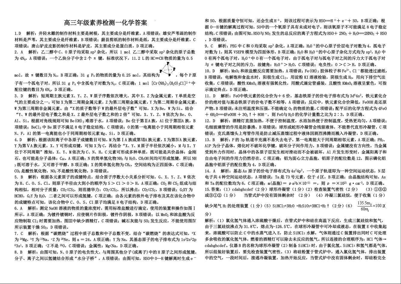 河北省衡水市第二中学2024-2025学年高三上学期素养检测(一)化学答案