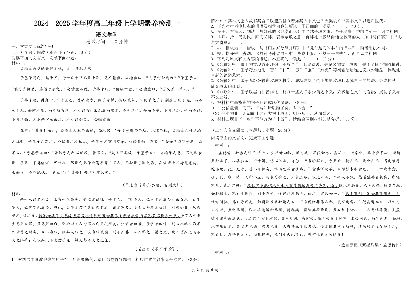 河北省衡水市第二中学2024-2025学年高三上学期素养检测(一)语文