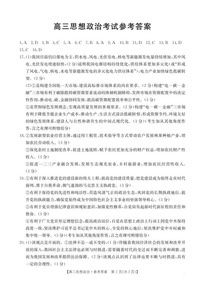 湖北省部分学校2024-2025学年高三年级10月联考 政治答案