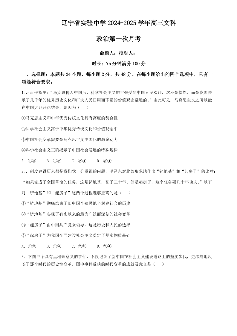 辽宁省实验中学2025届高三上学期第一次月考 政治