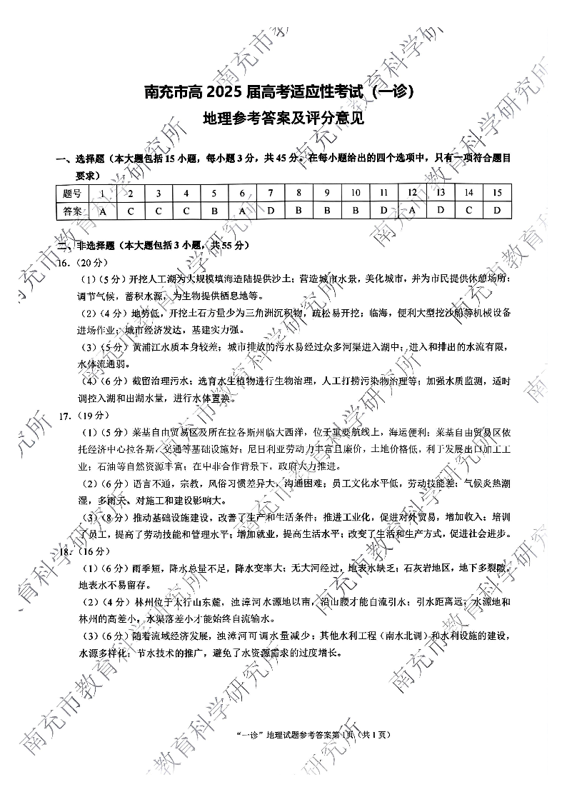 四川省南充市2025届高三高考适应性考试(一诊)地理答案