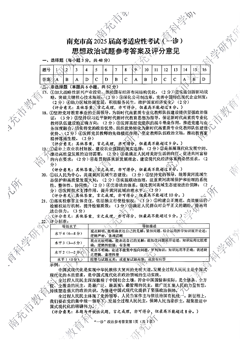 四川省南充市2025届高三高考适应性考试(一诊)政治答案