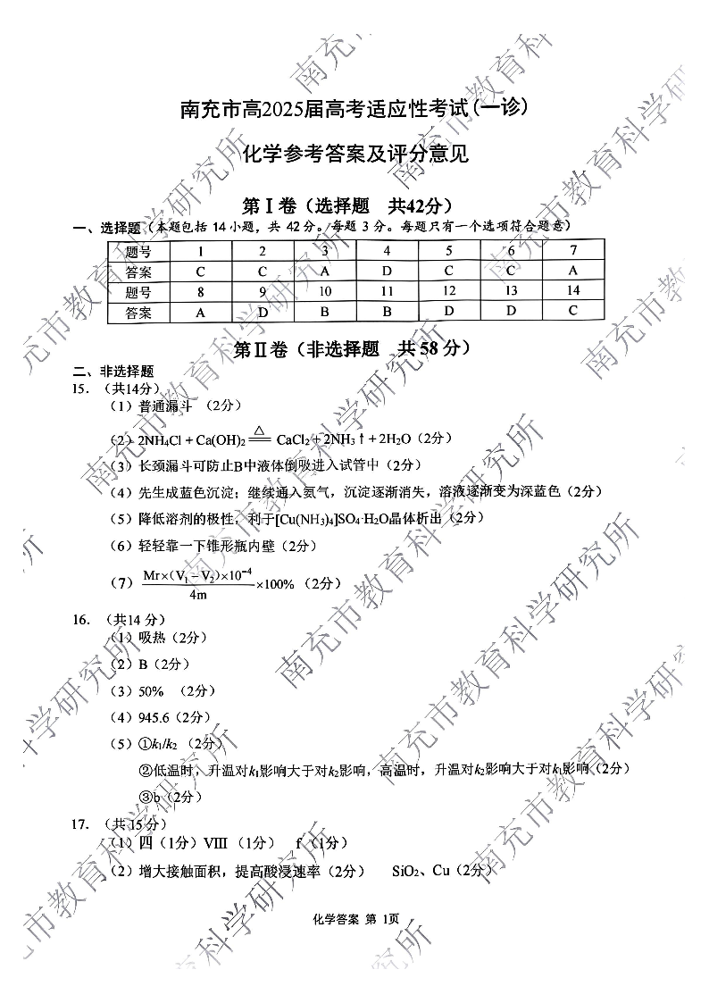 四川省南充市2025届高三高考适应性考试(一诊)化学答案