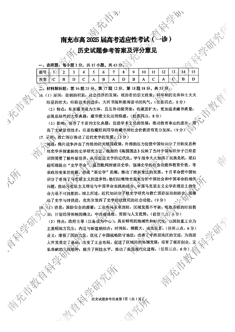 四川省南充市2025届高三高考适应性考试(一诊)历史答案