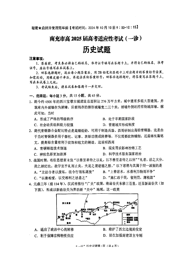 四川省南充市2025届高三高考适应性考试(一诊)历史