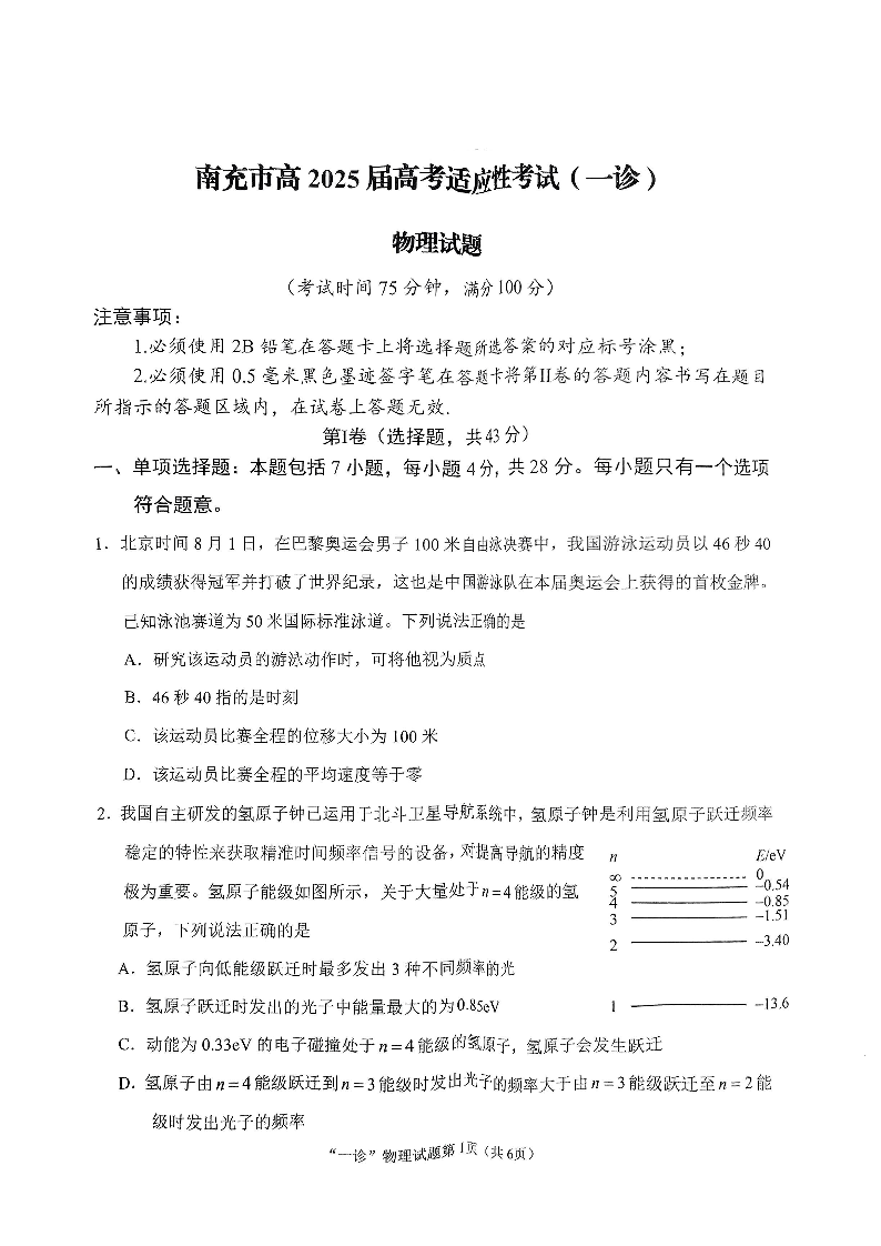 四川省南充市2025届高三高考适应性考试(一诊)物理
