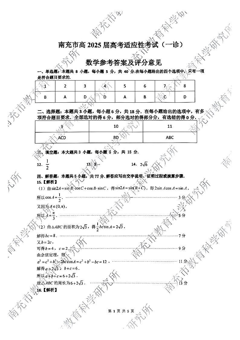 四川省南充市2025届高三高考适应性考试(一诊)数学答案