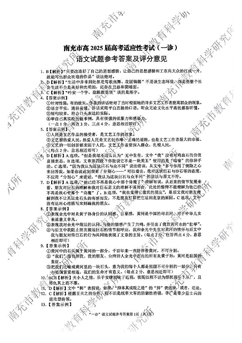 四川省南充市2025届高三高考适应性考试(一诊)语文答案