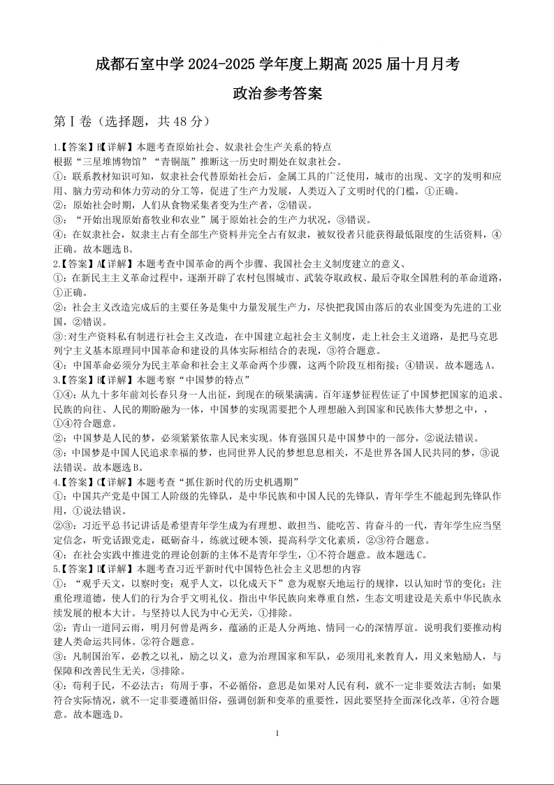 四川省成都市石室中学2024-2025学年高三上学期10月月考 政治答案