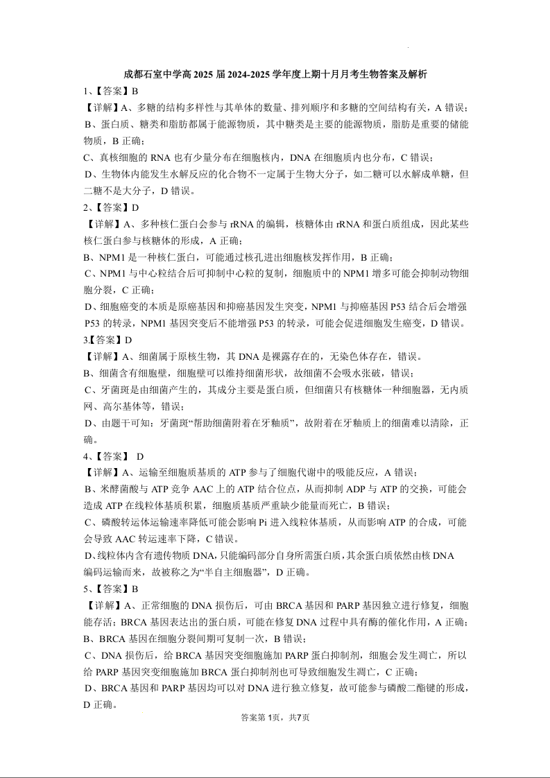 四川省成都市石室中学2024-2025学年高三上学期10月月考 生物答案