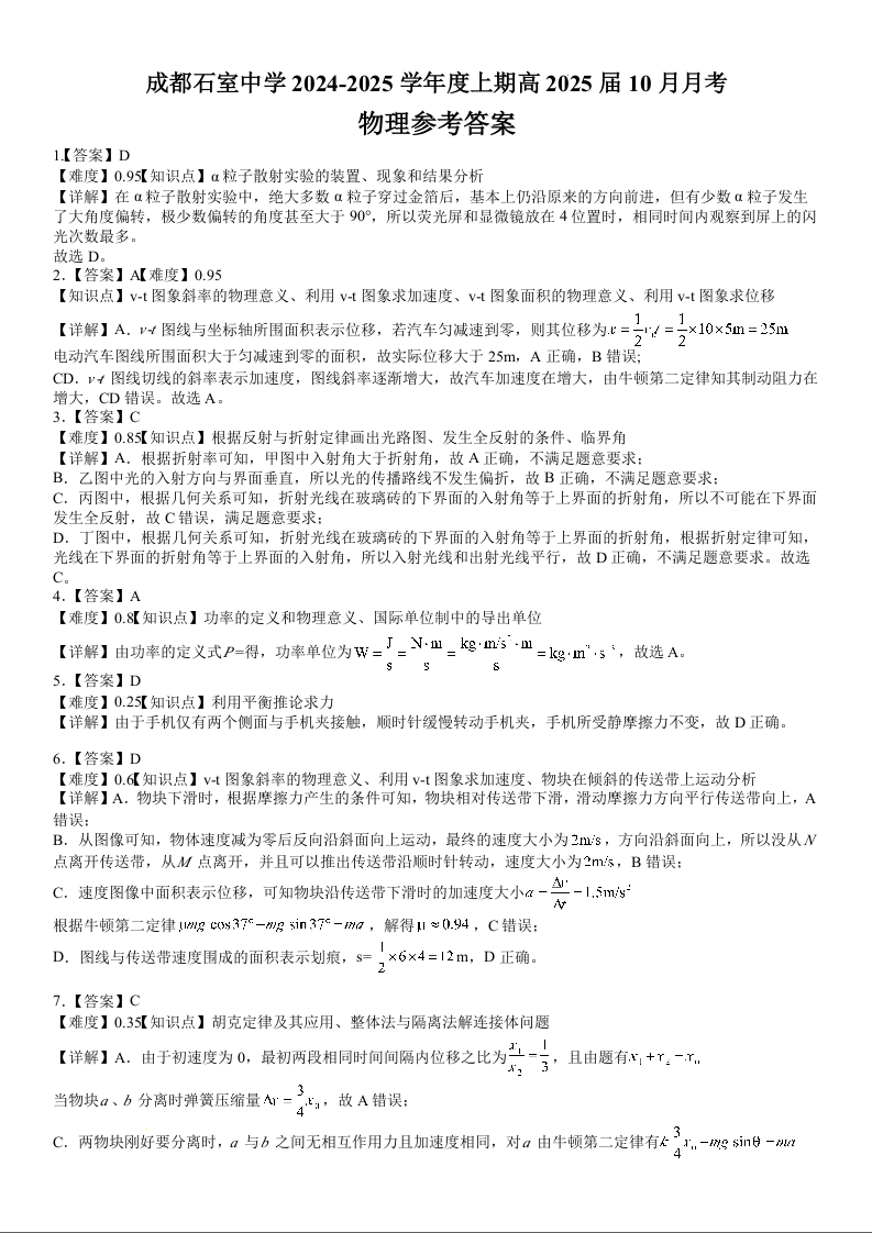 四川省成都市石室中学2024-2025学年高三上学期10月月考 物理答案