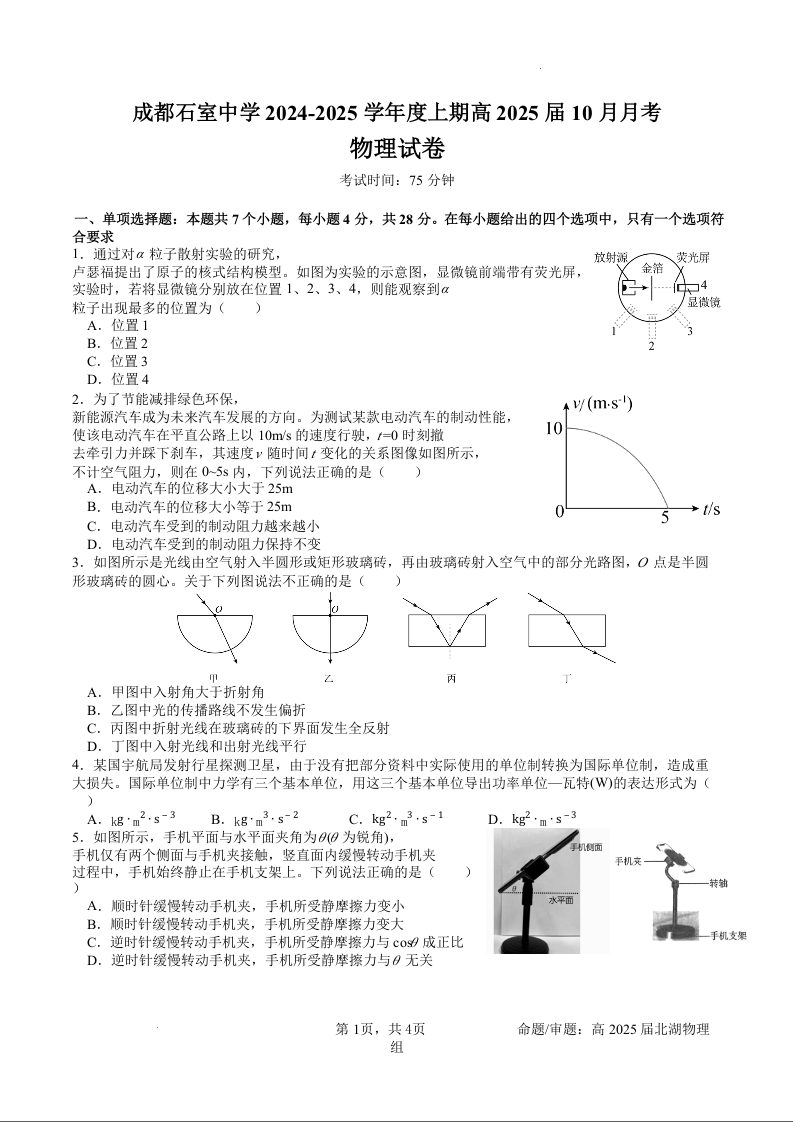 四川省成都市石室中学2024-2025学年高三上学期10月月考 物理