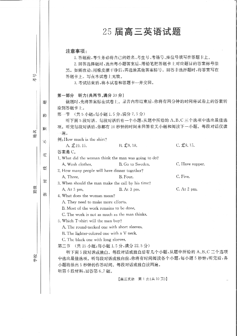四川省部分学校2025届高三10月联考 英语