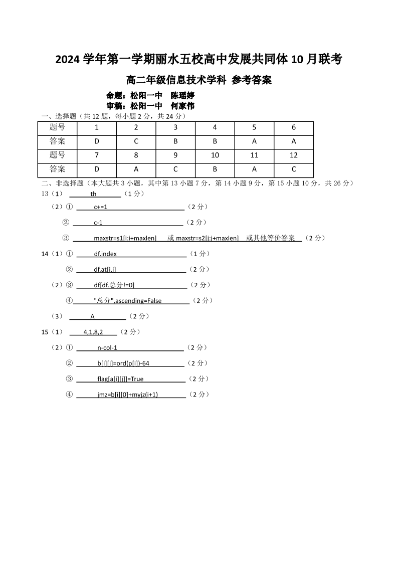 丽水五校高中发展共同体2024学年高二第一学期10月联考 技术答案
