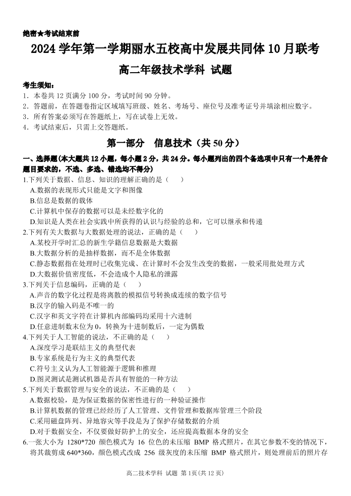 丽水五校高中发展共同体2024学年高二第一学期10月联考 技术