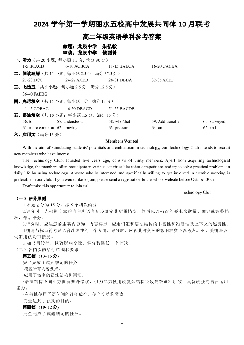 丽水五校高中发展共同体2024学年高二第一学期10月联考 英语答案