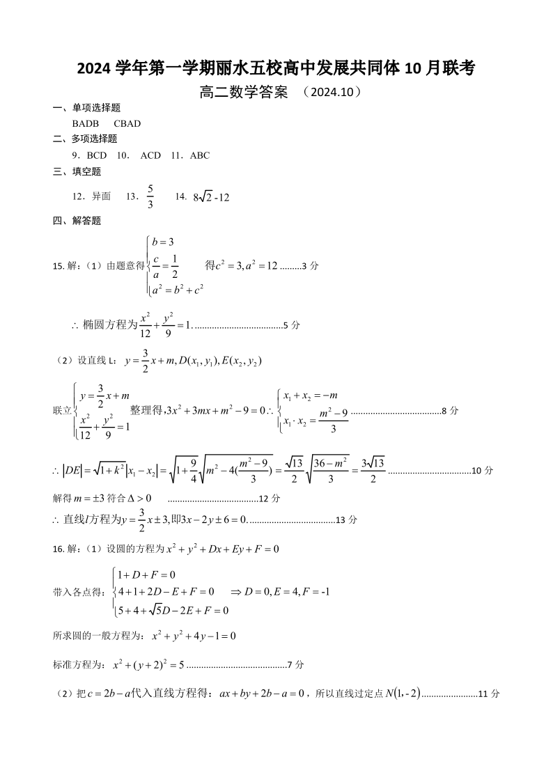 丽水五校高中发展共同体2024学年高二第一学期10月联考 数学答案