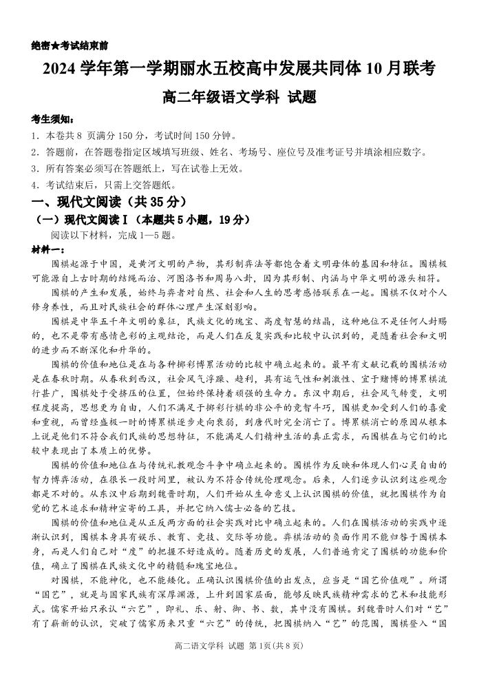 丽水五校高中发展共同体2024学年高二第一学期10月联考 语文
