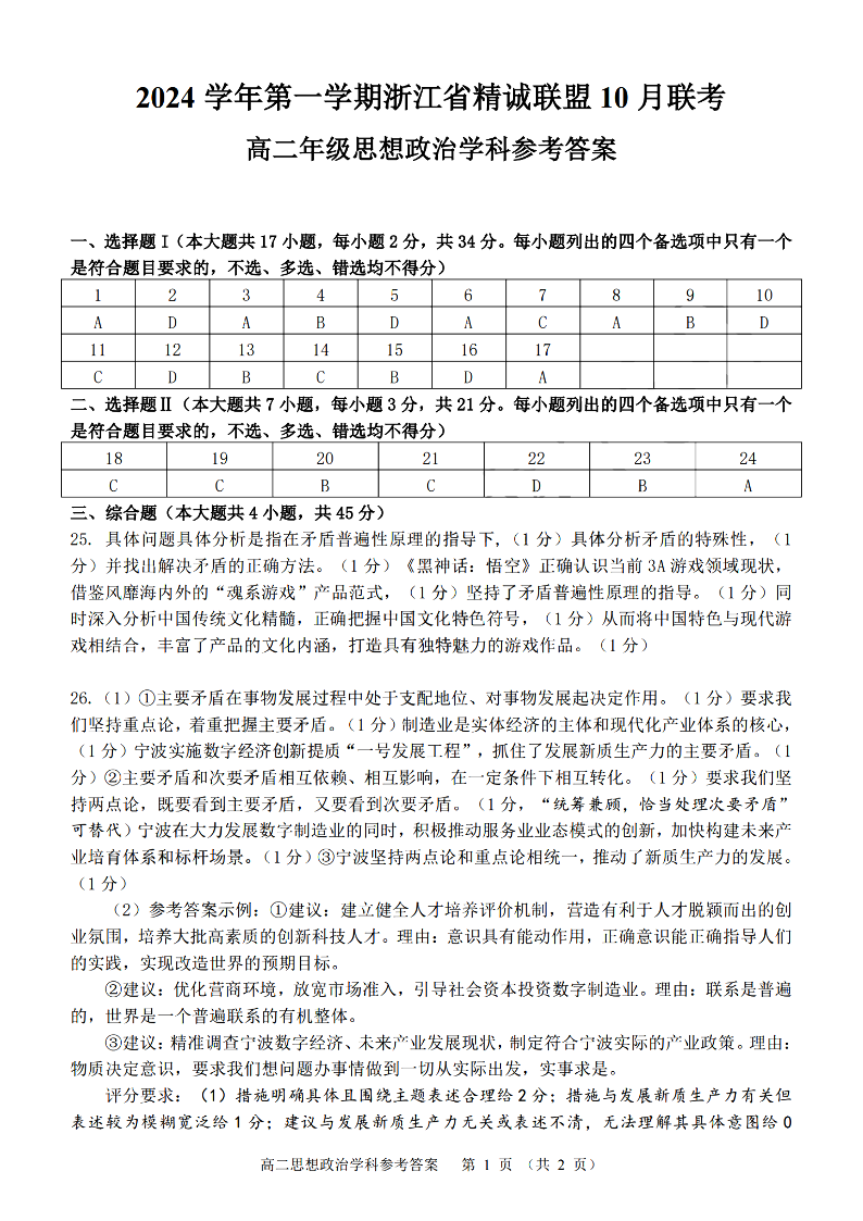 浙江省精诚联盟2024学年高二第一学期10月联考 政治答案