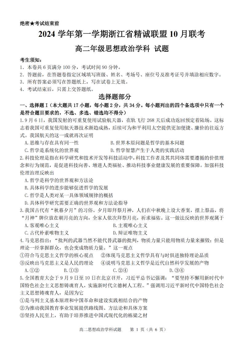 浙江省精诚联盟2024学年高二第一学期10月联考 政治