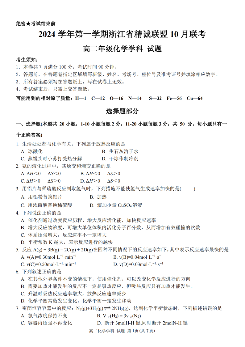 浙江省精诚联盟2024学年高二第一学期10月联考 化学