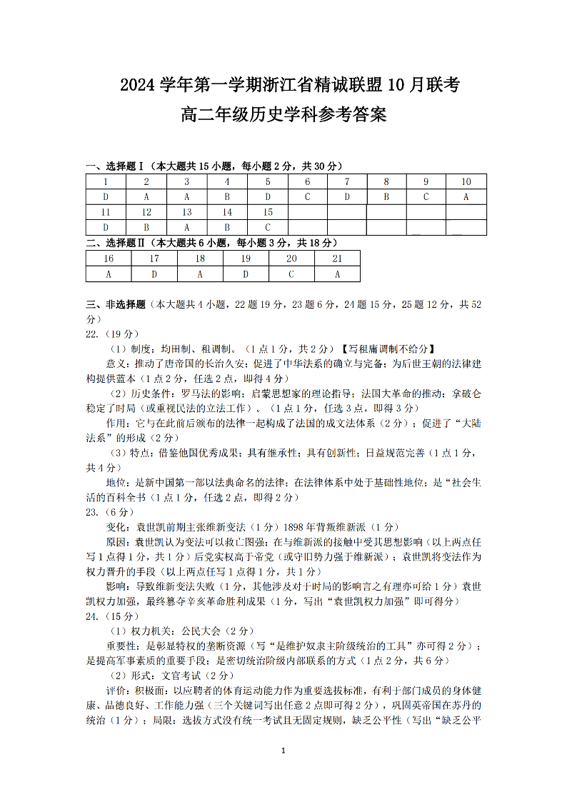 浙江省精诚联盟2024学年高二第一学期10月联考 历史答案