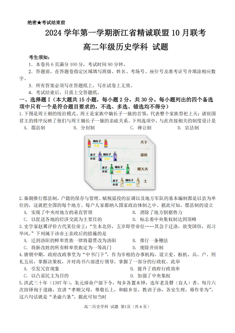 浙江省精诚联盟2024学年高二第一学期10月联考 历史