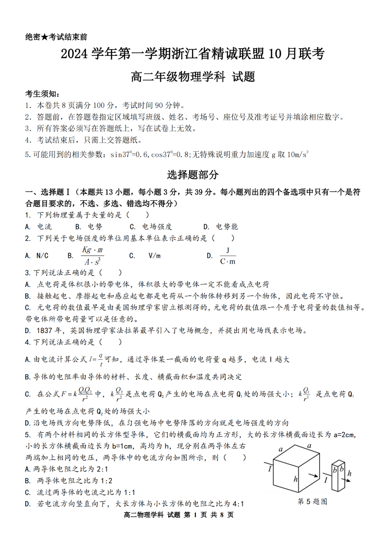 浙江省精诚联盟2024学年高二第一学期10月联考 物理