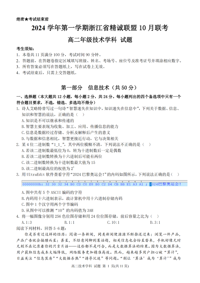 浙江省精诚联盟2024学年高二第一学期10月联考 技术