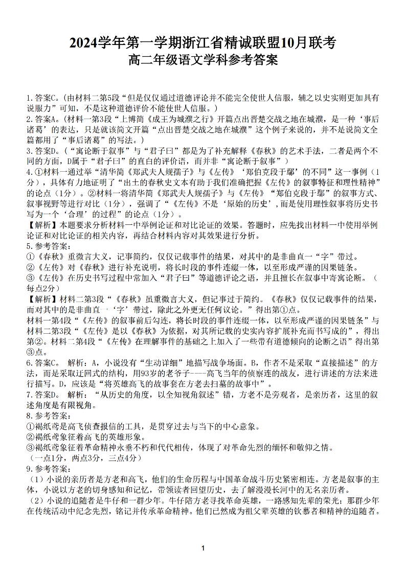 浙江省精诚联盟2024学年高二第一学期10月联考 语文答案