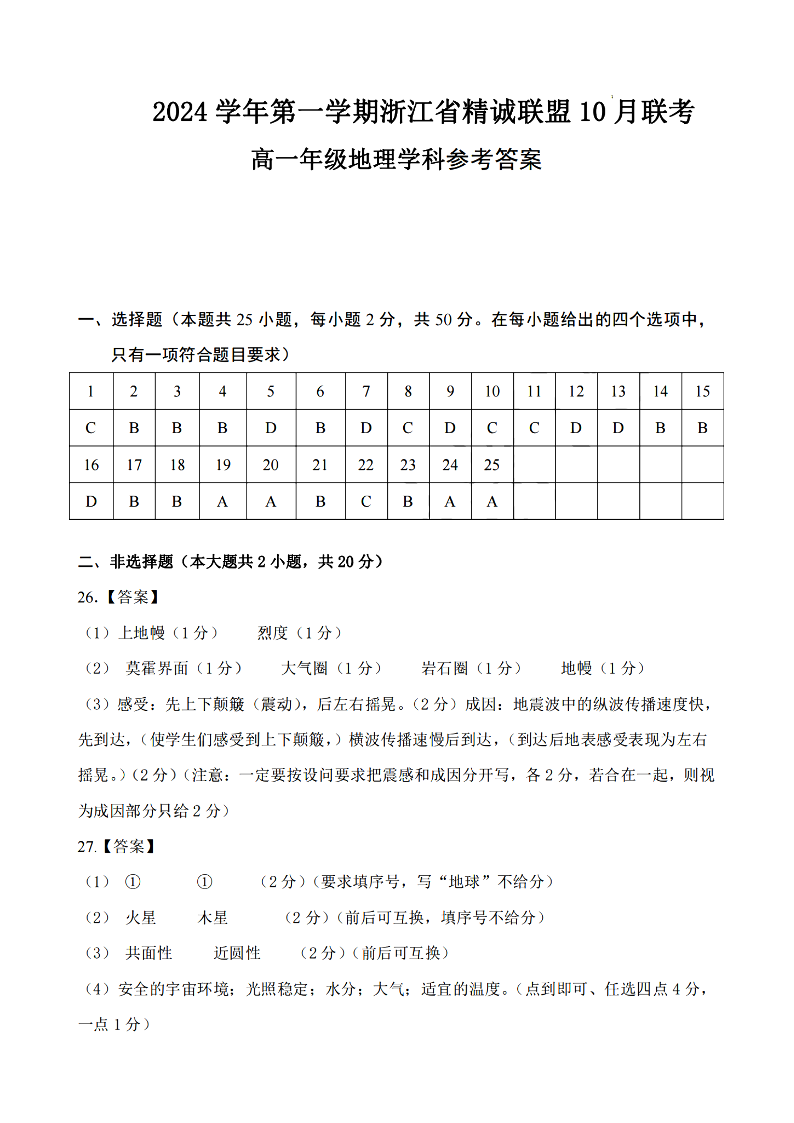 浙江省精诚联盟2024学年高一第一学期10月联考 地理答案
