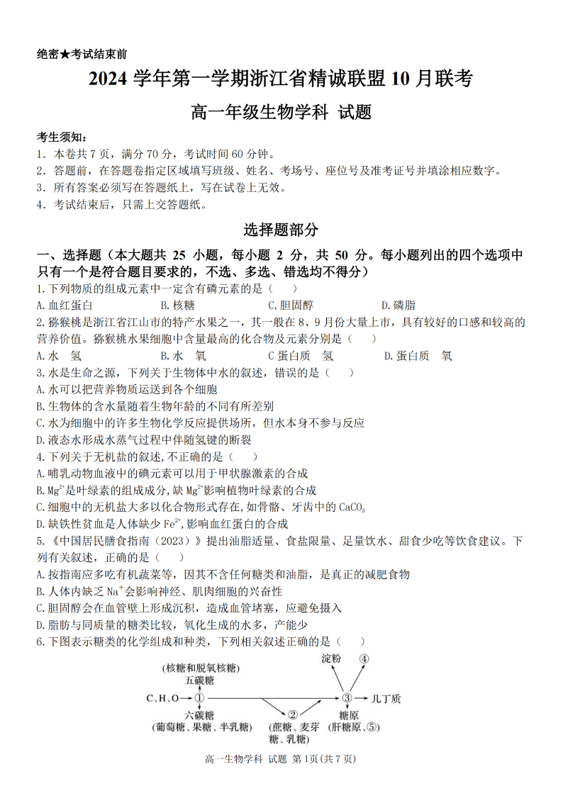 浙江省精诚联盟2024学年高一第一学期10月联考 生物