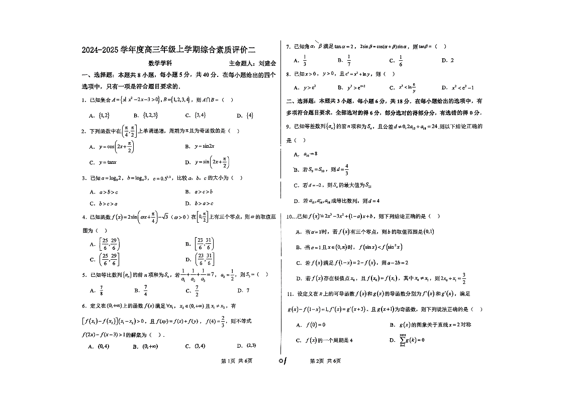 河北省衡水中学2024-2025学年高三上学期综合素质评价二 数学