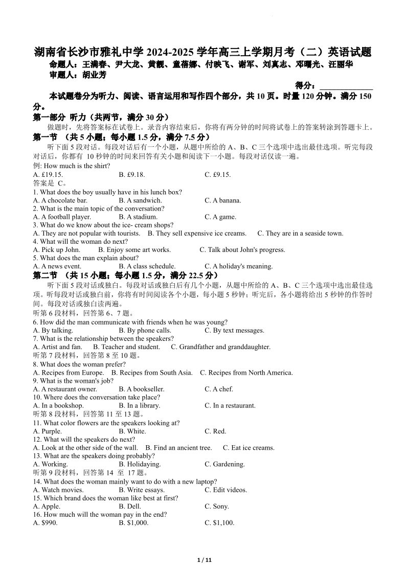 湖南省雅礼中学2025届高三上学期月考试卷(二 )英语