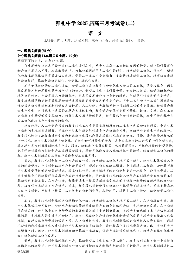 湖南省雅礼中学2025届高三上学期月考试卷(二 )语文