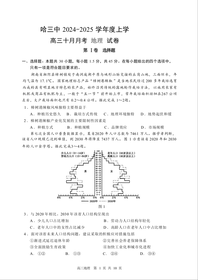 黑龙江省哈尔滨市第三中学2024-2025学年高三10月月考 地理