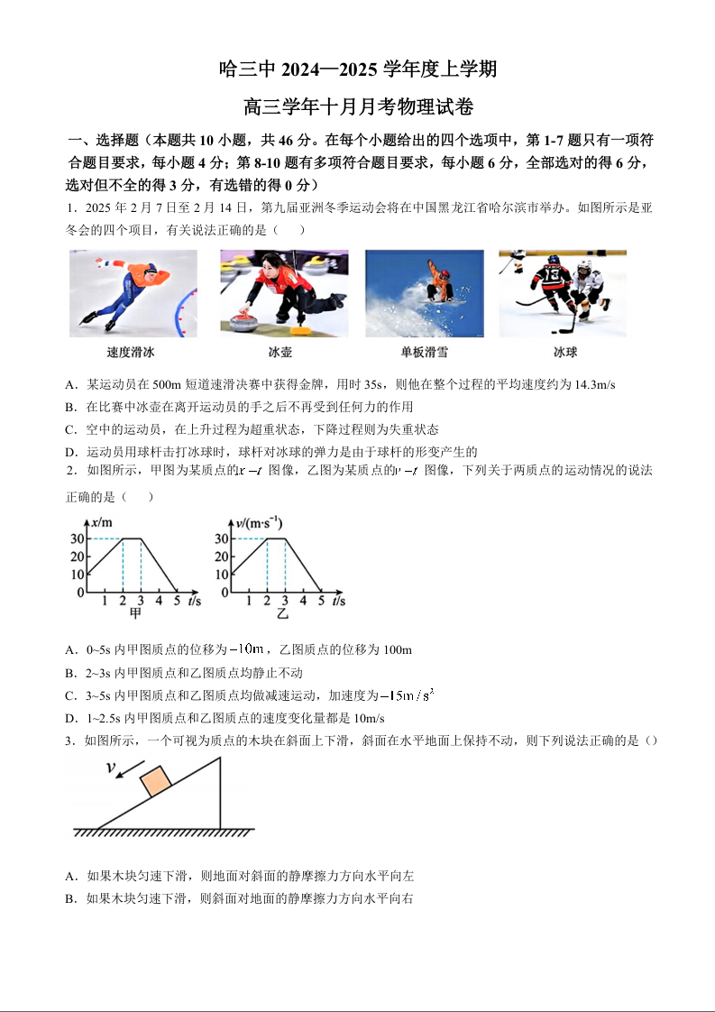 黑龙江省哈尔滨市第三中学2024-2025学年高三10月月考 物理