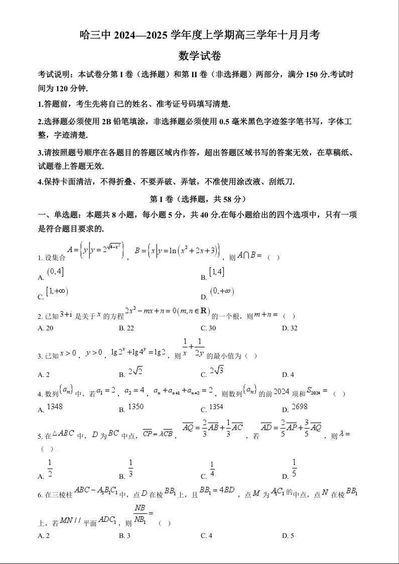 黑龙江省哈尔滨市第三中学2024-2025学年高三10月月考 数学