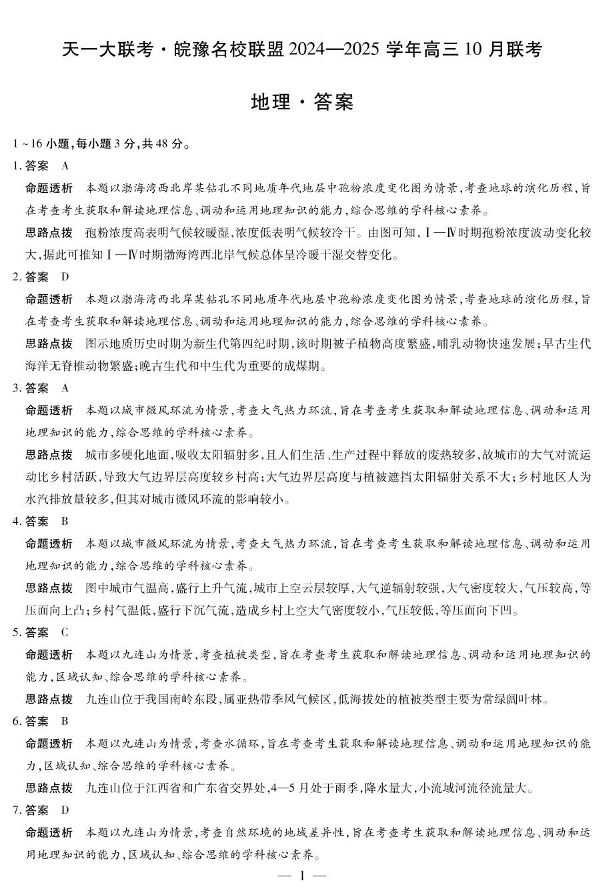 天一大联考●皖豫名校联盟2024-2025学年高三上学期10月月考 地理答案
