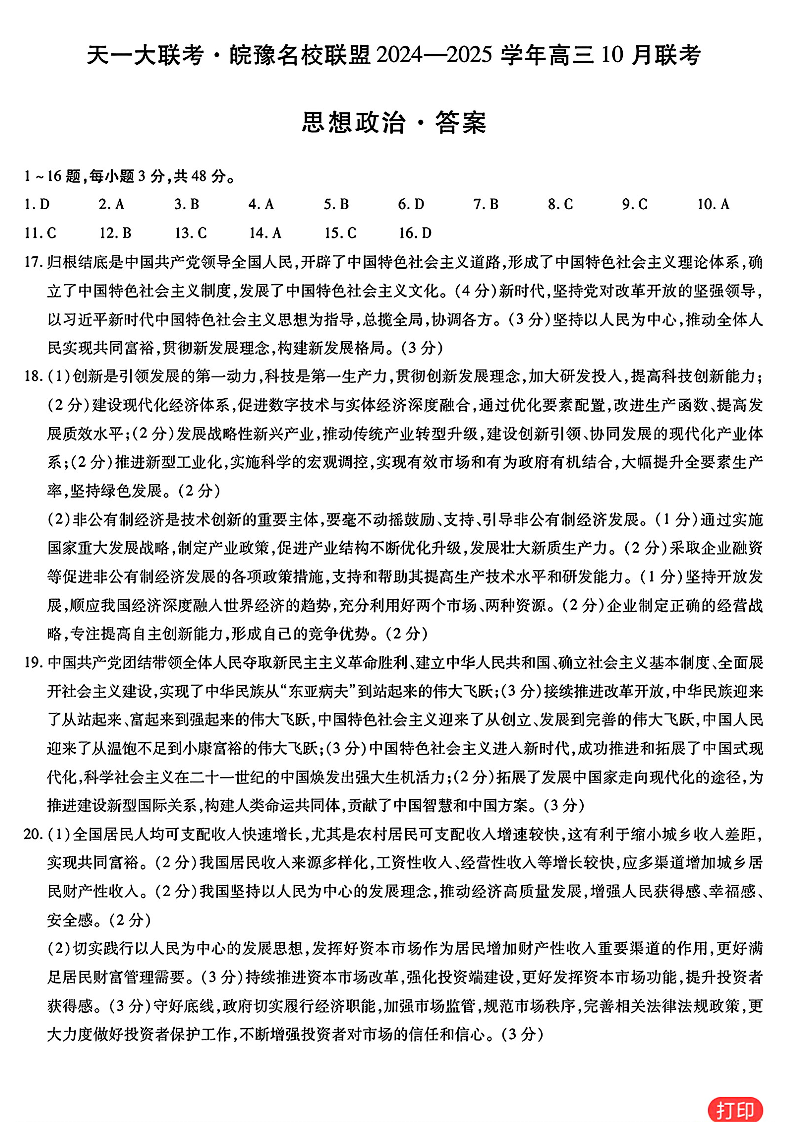 天一大联考●皖豫名校联盟2024-2025学年高三上学期10月月考 政治答案
