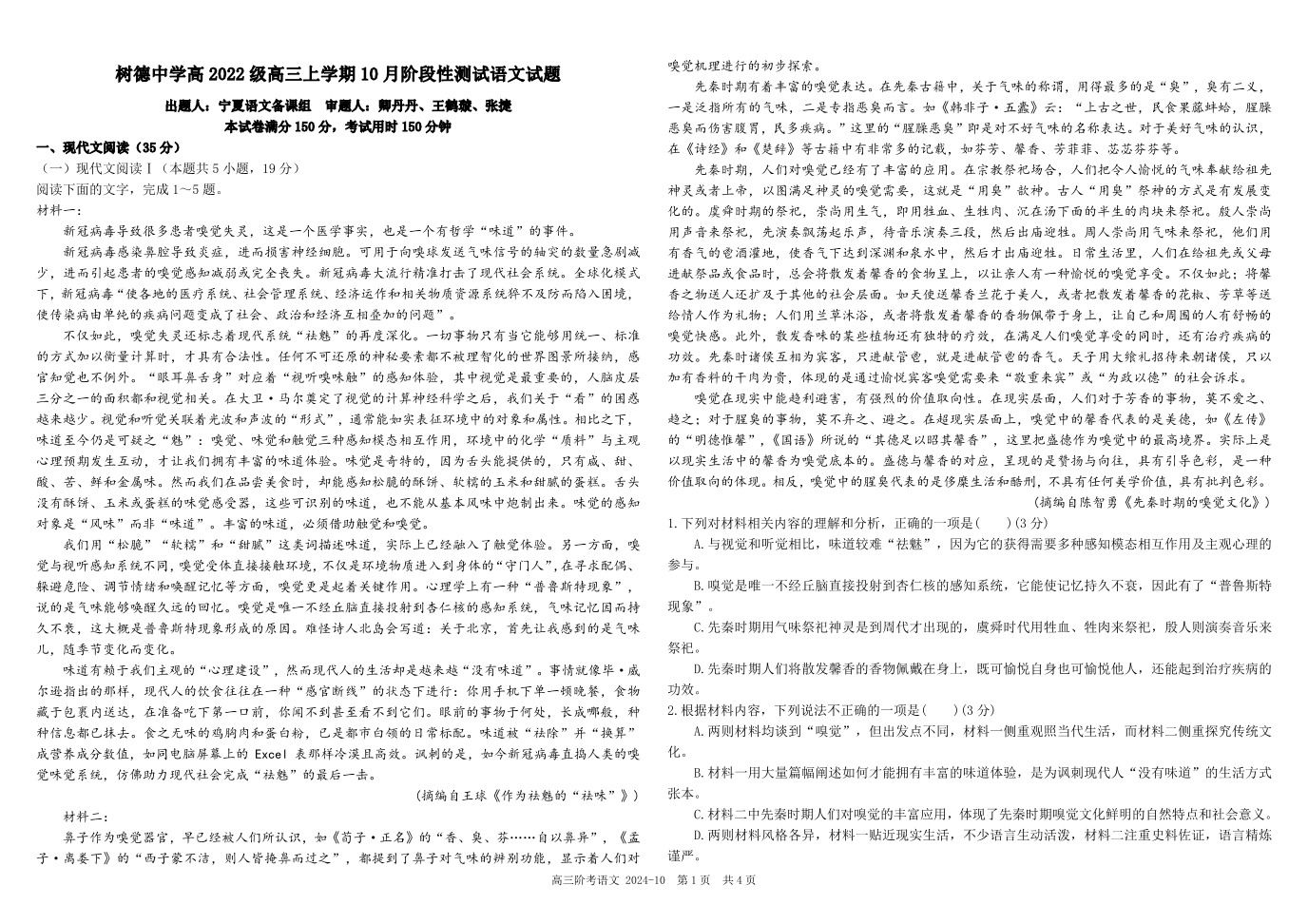四川省成都市树德中学2025届高三上学期10月月考 语文