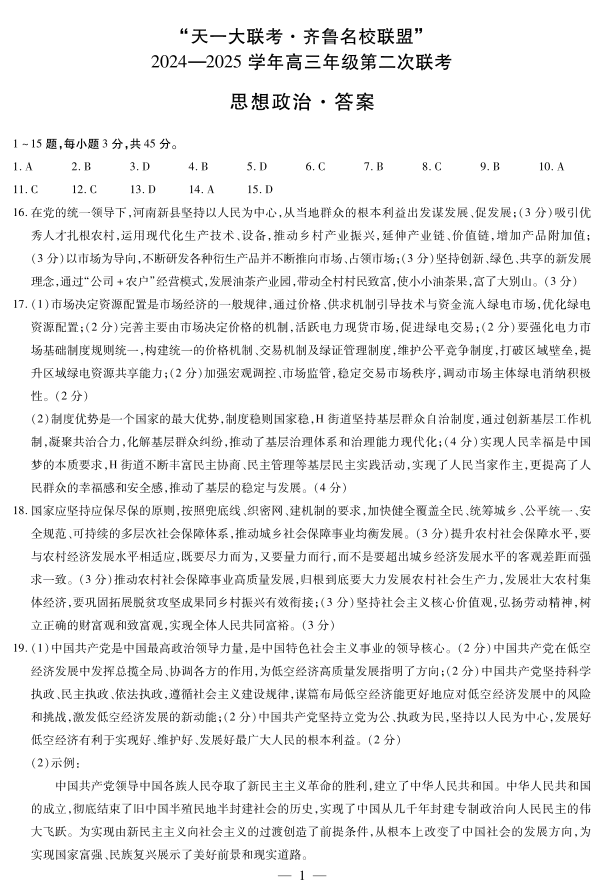 山东省齐鲁名校2024-2025学年高三年级第二次联考 政治答案
