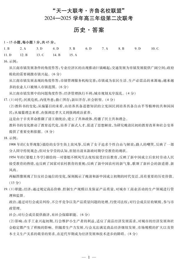 山东省齐鲁名校2024-2025学年高三年级第二次联考 历史答案