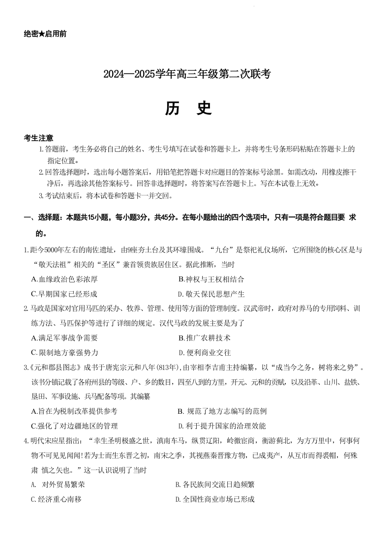 山东省齐鲁名校2024-2025学年高三年级第二次联考 历史
