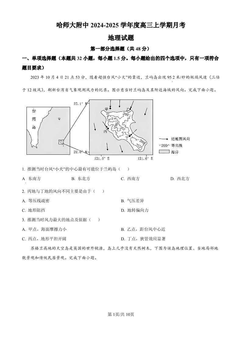 黑龙江省哈尔滨师范大学附属中学2024-2025学年高三上学期10月月考 地理