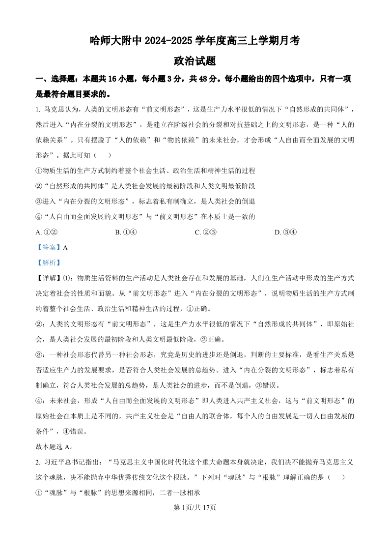 黑龙江省哈尔滨师范大学附属中学2024-2025学年高三上学期10月月考 政治答案
