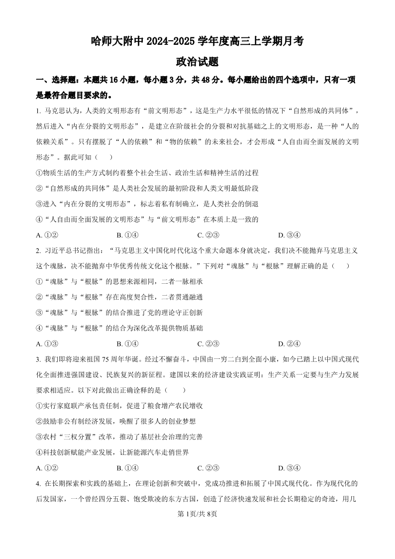黑龙江省哈尔滨师范大学附属中学2024-2025学年高三上学期10月月考 政治