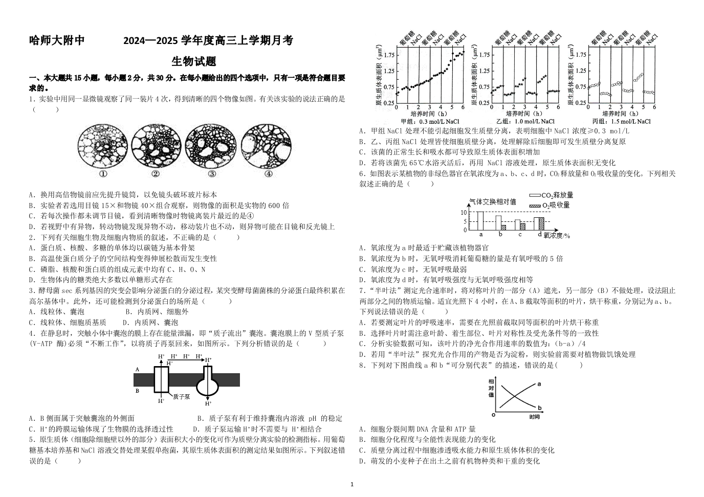 黑龙江省哈尔滨师范大学附属中学2024-2025学年高三上学期10月月考 生物