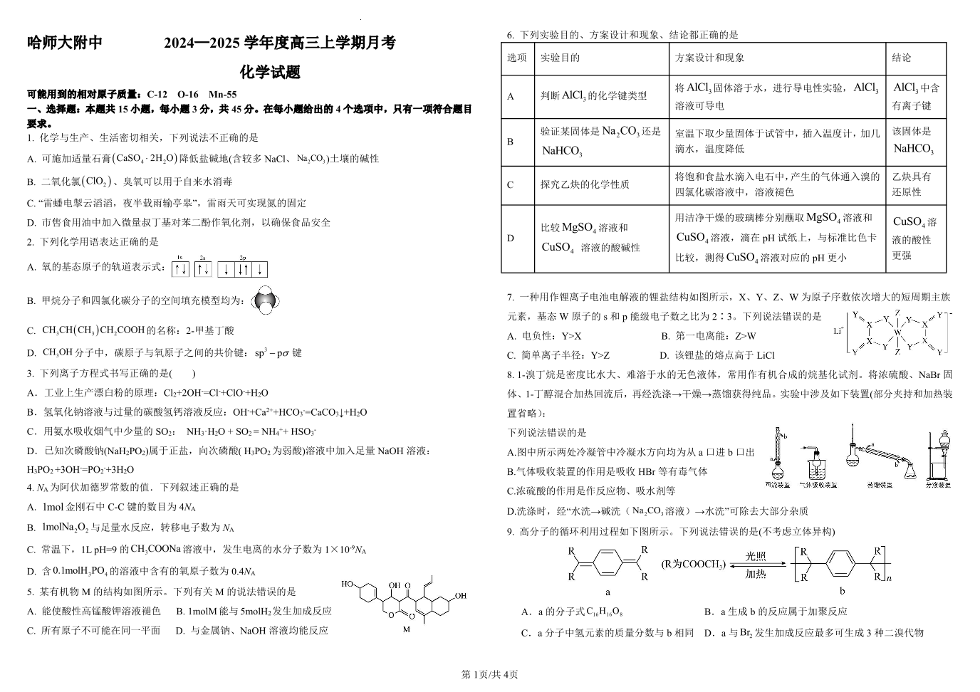 黑龙江省哈尔滨师范大学附属中学2024-2025学年高三上学期10月月考 化学