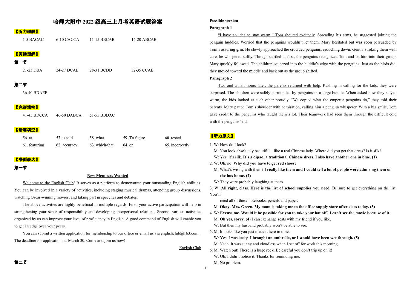 黑龙江省哈尔滨师范大学附属中学2024-2025学年高三上学期10月月考 英语答案